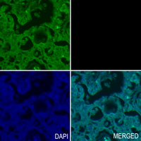Immunohistochemical analysis of AMPK gamma 1 staining in human ovarian formalin fixed paraffin embedded tissue section. The section was pre-treated using heat mediated antigen retrieval with sodium citrate buffer (pH 6.0). The section was then incubated with the antibody at room temperature and detected using an HRP conjugated compact polymer system. Tyramide-AF488 (green) was used as the chromogen. The section was then counterstained with DAPI (blue).