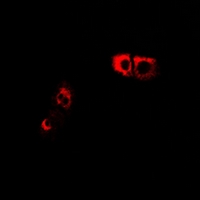 Immunofluorescent analysis of GPR66 staining in LOVO cells. Formalin-fixed cells were permeabilized with 0.1% Triton X-100 in TBS for 5-10 minutes and blocked with 3% BSA-PBS for 30 minutes at room temperature. Cells were probed with the primary antibody in 3% BSA-PBS and incubated overnight at 4 °C in a hidified chamber. Cells were washed with PBST and incubated with Alexa Fluor 647-conjugated secondary antibody (red) in PBS at room temperature in the dark.