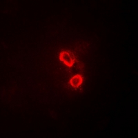 Immunofluorescent analysis of SYK staining in COS7 cells. Formalin-fixed cells were permeabilized with 0.1% Triton X-100 in TBS for 5-10 minutes and blocked with 3% BSA-PBS for 30 minutes at room temperature. Cells were probed with the primary antibody in 3% BSA-PBS and incubated overnight at 4 °C in a hidified chamber. Cells were washed with PBST and incubated with Alexa Fluor 647-conjugated secondary antibody (red) in PBS at room temperature in the dark.