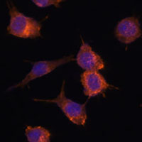 Immunofluorescent analysis of Advillin staining in L929 cells. Formalin-fixed cells were permeabilized with 0.1% Triton X-100 in TBS for 5-10 minutes and blocked with 3% BSA-PBS for 30 minutes at room temperature. Cells were probed with the primary antibody in 3% BSA-PBS and incubated overnight at 4 °C in a humidified chamber. Cells were washed with PBST and incubated with a AF594-conjugated secondary antibody (red) in PBS at room temperature in the dark. DAPI was used to stain the cell nuclei (blue).