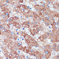 Immunohistochemical analysis of beta 3Gn-T3 staining in human liver formalin fixed paraffin embedded tissue section. The section was pre-treated using heat mediated antigen retrieval with sodium citrate buffer (pH 6.0). The section was then incubated with the antibody at room temperature and detected using an HRP conjugated compact polymer system. DAB was used as the chromogen. The section was then counterstained with haematoxylin and mounted with DPX.