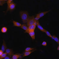 Immunofluorescent analysis of PUMA staining in NIH3T3 cells. Formalin-fixed cells were permeabilized with 0.1% Triton X-100 in TBS for 5-10 minutes and blocked with 3% BSA-PBS for 30 minutes at room temperature. Cells were probed with the primary antibody in 3% BSA-PBS and incubated overnight at 4 °C in a humidified chamber. Cells were washed with PBST and incubated with a AF594-conjugated secondary antibody (red) in PBS at room temperature in the dark. DAPI was used to stain the cell nuclei (blue).