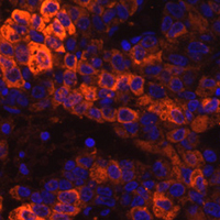 Immunofluorescent analysis of BHMT staining in human liver cancer tissues. Formalin-fixed cells were permeabilized with 0.1% Triton X-100 in TBS for 5-10 minutes and blocked with 3% BSA-PBS for 30 minutes at room temperature. Cells were probed with the primary antibody in 3% BSA-PBS and incubated overnight at 4 °C in a hidified chamber. Cells were washed with PBST and incubated with a Alexa Fluor 594-conjugated secondary antibody (red) in PBS at room temperature in the dark.