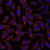 Immunofluorescent analysis of BZW2 staining in L929 cells. Formalin-fixed cells were permeabilized with 0.1% Triton X-100 in TBS for 5-10 minutes and blocked with 3% BSA-PBS for 30 minutes at room temperature. Cells were probed with the primary antibody in 3% BSA-PBS and incubated overnight at 4 °C in a humidified chamber. Cells were washed with PBST and incubated with a AF594-conjugated secondary antibody (red) in PBS at room temperature in the dark. DAPI was used to stain the cell nuclei (blue).