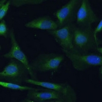 Immunofluorescent analysis of CAML staining in U2OS cells. Formalin-fixed cells were permeabilized with 0.1% Triton X-100 in TBS for 5-10 minutes and blocked with 3% BSA-PBS for 30 minutes at room temperature. Cells were probed with the primary antibody in 3% BSA-PBS and incubated overnight at 4 °C in a hidified chamber. Cells were washed with PBST and incubated with a Alexa Fluor 488-conjugated secondary antibody (green) in PBS at room temperature in the dark.