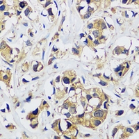 Immunohistochemical analysis of CAML staining in human breast cancer formalin fixed paraffin embedded tissue section. The section was pre-treated using heat mediated antigen retrieval with sodium citrate buffer (pH 6.0). The section was then incubated with the antibody at room temperature and detected using an HRP conjugated compact polymer system. DAB was used as the chromogen. The section was then counterstained with haematoxylin and mounted with DPX.