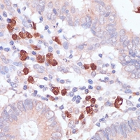 Immunohistochemical analysis of CD82 staining in human colon formalin fixed paraffin embedded tissue section. The section was pre-treated using heat mediated antigen retrieval with sodium citrate buffer (pH 6.0). The section was then incubated with the antibody at room temperature and detected using an HRP conjugated compact polymer system. DAB was used as the chromogen. The section was then counterstained with haematoxylin and mounted with DPX.