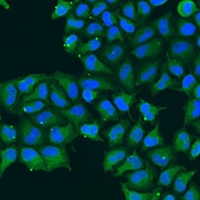 Immunofluorescent analysis of CDK16 staining in U2OS cells. Formalin-fixed cells were permeabilized with 0.1% Triton X-100 in TBS for 5-10 minutes and blocked with 3% BSA-PBS for 30 minutes at room temperature. Cells were probed with the primary antibody in 3% BSA-PBS and incubated overnight at 4 °C in a hidified chamber. Cells were washed with PBST and incubated with a Alexa Fluor 488-conjugated secondary antibody (green) in PBS at room temperature in the dark.