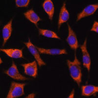 Immunofluorescent analysis of CHCHD2 staining in L929 cells. Formalin-fixed cells were permeabilized with 0.1% Triton X-100 in TBS for 5-10 minutes and blocked with 3% BSA-PBS for 30 minutes at room temperature. Cells were probed with the primary antibody in 3% BSA-PBS and incubated overnight at 4 °C in a humidified chamber. Cells were washed with PBST and incubated with a AF594-conjugated secondary antibody (red) in PBS at room temperature in the dark. DAPI was used to stain the cell nuclei (blue).