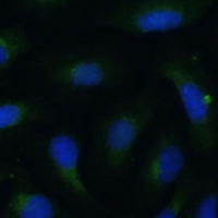 Immunofluorescent analysis of COPG2 staining in U2OS cells. Formalin-fixed cells were permeabilized with 0.1% Triton X-100 in TBS for 5-10 minutes and blocked with 3% BSA-PBS for 30 minutes at room temperature. Cells were probed with the primary antibody in 3% BSA-PBS and incubated overnight at 4 °C in a hidified chamber. Cells were washed with PBST and incubated with a Alexa Fluor 488-conjugated secondary antibody (green) in PBS at room temperature in the dark.