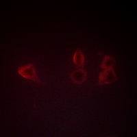 Immunofluorescent analysis of TIE2 (Phospho-Y1108) staining in HepG2 cells. Formalin-fixed cells were permeabilized with 0.1% Triton X-100 in TBS for 5-10 minutes and blocked with 3% BSA-PBS for 30 minutes at room temperature. Cells were probed with the primary antibody in 3% BSA-PBS and incubated overnight at 4 °C in a hidified chamber. Cells were washed with PBST and incubated with a AF594-conjugated secondary antibody (red) in PBS at room temperature in the dark.