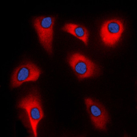 Immunofluorescent analysis of p39 staining in HeLa cells. Formalin-fixed cells were permeabilized with 0.1% Triton X-100 in TBS for 5-10 minutes and blocked with 3% BSA-PBS for 30 minutes at room temperature. Cells were probed with the primary antibody in 3% BSA-PBS and incubated overnight at 4 °C in a humidified chamber. Cells were washed with PBST and incubated with a DyLight 594-conjugated secondary antibody (red) in PBS at room temperature in the dark. DAPI was used to stain the cell nuclei (blue).