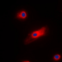 Immunofluorescent analysis of Cone Arrestin staining in HepG2 cells. Formalin-fixed cells were permeabilized with 0.1% Triton X-100 in TBS for 5-10 minutes and blocked with 3% BSA-PBS for 30 minutes at room temperature. Cells were probed with the primary antibody in 3% BSA-PBS and incubated overnight at 4 °C in a hidified chamber. Cells were washed with PBST and incubated with a DyLight 594-conjugated secondary antibody (red) in PBS at room temperature in the dark. DAPI was used to stain the cell nuclei (blue).