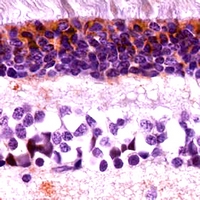 Immunohistochemical analysis of Cone Arrestin staining in human retina formalin fixed paraffin embedded tissue section. The section was pre-treated using heat mediated antigen retrieval with sodium citrate buffer (pH 6.0). The section was then incubated with the antibody at room temperature and detected using an HRP conjugated compact polymer system. DAB was used as the chromogen. The section was then counterstained with haematoxylin and mounted with DPX. -