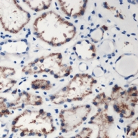 Immunohistochemical analysis of DMGDH staining in human kidney formalin fixed paraffin embedded tissue section. The section was pre-treated using heat mediated antigen retrieval with sodium citrate buffer (pH 6.0). The section was then incubated with the antibody at room temperature and detected using an HRP conjugated compact polymer system. DAB was used as the chromogen. The section was then counterstained with haematoxylin and mounted with DPX.