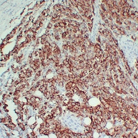 Immunohistochemical analysis of CD63 staining in human malignant melanoma formalin fixed paraffin embedded tissue section. The section was pre-treated using heat mediated antigen retrieval with sodium citrate buffer (pH 6.0). The section was then incubated with the antibody at room temperature and detected using an HRP conjugated compact polymer system. DAB was used as the chromogen. The section was then counterstained with haematoxylin and mounted with DPX.