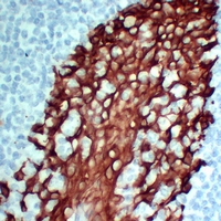 • Immunohistochemical analysis of Cytokeratin 5 staining in human tonsil formalin fixed paraffin embedded tissue section. The section was pre-treated using heat mediated antigen retrieval with sodium citrate buffer (pH 6.0). The section was then incubated with the antibody at room temperature and detected using an HRP conjugated compact polymer system. DAB was used as the chromogen. The section was then counterstained with haematoxylin and mounted with DPX.