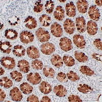 Description:Mouse monoclonal antibody to MUC2Immunogen:KLH-conjugated synthetic peptide encompassing a sequence within human MUC2. The exact sequence is proprietary.Purification:The antibody was purified by immunogen affinity chromatography.Clonality:MonoclonalForm:Mouse IgG2b. Liquid in PBS containing 50% glycerol, 0.2% BSA and 0.01% sodium azide.Dilution:IH (1/100 - 1/300)Gene Symbol:MUC2Alternative Names:SMUC; Mucin-2; MUC-2; Intestinal mucin-2