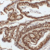 Immunohistochemical analysis of Nucleophosmin staining in human colon carcinoma formalin fixed paraffin embedded tissue section. The section was pre-treated using heat mediated antigen retrieval with sodium citrate buffer (pH 6.0). The section was then incubated with the antibody at room temperature and detected using an HRP conjugated compact polymer system. DAB was used as the chromogen. The section was then counterstained with haematoxylin and mounted with DPX. -