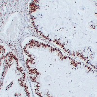 Immunohistochemical analysis of Nucleophosmin staining in human ovarian mucinous formalin fixed paraffin embedded tissue section. The section was pre-treated using heat mediated antigen retrieval with sodium citrate buffer (pH 6.0). The section was then incubated with the antibody at room temperature and detected using an HRP conjugated compact polymer system. DAB was used as the chromogen. The section was then counterstained with haematoxylin and mounted with DPX. -