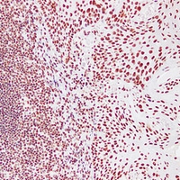 Immunohistochemical analysis of Nucleophosmin staining in human tonsil formalin fixed paraffin embedded tissue section. The section was pre-treated using heat mediated antigen retrieval with sodium citrate buffer (pH 6.0). The section was then incubated with the antibody at room temperature and detected using an HRP conjugated compact polymer system. DAB was used as the chromogen. The section was then counterstained with haematoxylin and mounted with DPX.