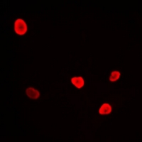 Immunofluorescent analysis of RFC4 staining in U2OS cells. Formalin-fixed cells were permeabilized with 0.1% Triton X-100 in TBS for 5-10 minutes and blocked with 3% BSA-PBS for 30 minutes at room temperature. Cells were probed with the primary antibody in 3% BSA-PBS and incubated overnight at 4 °C in a hidified chamber. Cells were washed with PBST and incubated with a DyLight 594-conjugated secondary antibody (red) in PBS at room temperature in the dark.