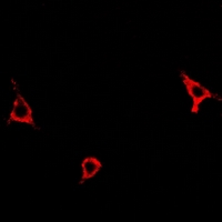 Immunofluorescent analysis of Asparagine Synthetase staining in A549 cells. Formalin-fixed cells were permeabilized with 0.1% Triton X-100 in TBS for 5-10 minutes and blocked with 3% BSA-PBS for 30 minutes at room temperature. Cells were probed with the primary antibody in 3% BSA-PBS and incubated overnight at 4 °C in a hidified chamber. Cells were washed with PBST and incubated with a DyLight 594-conjugated secondary antibody (red) in PBS at room temperature in the dark.