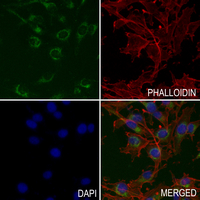 Immunofluorescent analysis of Aconitase 2 staining in MDAMB231 cells. Formalin-fixed cells were permeabilized with 0.1% Triton X-100 in TBS for 5-10 minutes and blocked with 3% BSA-PBS for 30 minutes at room temperature. Cells were probed with the primary antibody in 3% BSA-PBS and incubated overnight at 4 °C in a hidified chamber. Cells were washed with PBST and incubated with a AF488-conjugated secondary antibody (green) in PBS at room temperature in the dark. Phalloidin - AF594 was used to stain Actin filaments (red). DAPI was used to stain the cell nuclei (blue).