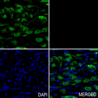 Immunohistochemical analysis of Aconitase 2 staining in human stomach cancer formalin fixed paraffin embedded tissue section. The section was pre-treated using heat mediated antigen retrieval with sodium citrate buffer (pH 6.0). The section was then incubated with the antibody at room temperature and detected using an HRP conjugated compact polymer system. Tyramide-AF488 (green) was used as the chromogen. The section was then counterstained with DAPI (blue). -