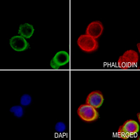 Immunofluorescent analysis of SBAT1 staining in MCF7 cells. Formalin-fixed cells were permeabilized with 0.1% Triton X-100 in TBS for 5-10 minutes and blocked with 3% BSA-PBS for 30 minutes at room temperature. Cells were probed with the primary antibody in 3% BSA-PBS and incubated overnight at 4 °C in a hidified chamber. Cells were washed with PBST and incubated with a AF488-conjugated secondary antibody (green) in PBS at room temperature in the dark. Phalloidin - AF594 was used to stain Actin filaments (red). DAPI was used to stain the cell nuclei (blue).
