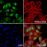 Immunofluorescent analysis of ATM (Phospho-S1981) staining in MCF7 cells. Formalin-fixed cells were permeabilized with 0.1% Triton X-100 in TBS for 5-10 minutes and blocked with 3% BSA-PBS for 30 minutes at room temperature. Cells were probed with the primary antibody in 3% BSA-PBS and incubated overnight at 4 °C in a hidified chamber. Cells were washed with PBST and incubated with a AF488-conjugated secondary antibody (green) in PBS at room temperature in the dark. Phalloidin - AF594 was used to stain Actin filaments (red). DAPI was used to stain the cell nuclei (blue).