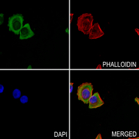 Immunofluorescent analysis of Cav1.2 staining in MCF7 cells. Formalin-fixed cells were permeabilized with 0.1% Triton X-100 in TBS for 5-10 minutes and blocked with 3% BSA-PBS for 30 minutes at room temperature. Cells were probed with the primary antibody in 3% BSA-PBS and incubated overnight at 4 °C in a hidified chamber. Cells were washed with PBST and incubated with a AF488-conjugated secondary antibody (green) in PBS at room temperature in the dark. Phalloidin - AF594 was used to stain Actin filaments (red). DAPI was used to stain the cell nuclei (blue).