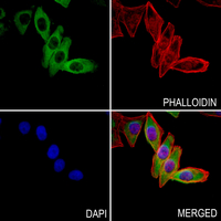 Immunofluorescent analysis of Cytochrome P450 8B1 staining in MCF7 cells. Formalin-fixed cells were permeabilized with 0.1% Triton X-100 in TBS for 5-10 minutes and blocked with 3% BSA-PBS for 30 minutes at room temperature. Cells were probed with the primary antibody in 3% BSA-PBS and incubated overnight at 4 °C in a hidified chamber. Cells were washed with PBST and incubated with a AF488-conjugated secondary antibody (green) in PBS at room temperature in the dark. Phalloidin - AF594 was used to stain Actin filaments (red). DAPI was used to stain the cell nuclei (blue).