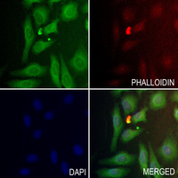 Immunofluorescent analysis of DYNC1I2 staining in A549 cells. Formalin-fixed cells were permeabilized with 0.1% Triton X-100 in TBS for 5-10 minutes and blocked with 3% BSA-PBS for 30 minutes at room temperature. Cells were probed with the primary antibody in 3% BSA-PBS and incubated overnight at 4 °C in a hidified chamber. Cells were washed with PBST and incubated with a AF488-conjugated secondary antibody (green) in PBS at room temperature in the dark. Phalloidin - AF594 was used to stain Actin filaments (red). DAPI was used to stain the cell nuclei (blue).