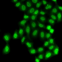 Immunofluorescent analysis of PHF11 staining in A549 cells. Formalin-fixed cells were permeabilized with 0.1% Triton X-100 in TBS for 5-10 minutes and blocked with 3% BSA-PBS for 30 minutes at room temperature. Cells were probed with the primary antibody in 3% BSA-PBS and incubated overnight at 4 °C in a hidified chamber. Cells were washed with PBST and incubated with a Alexa Fluor 488-conjugated secondary antibody (green) in PBS at room temperature in the dark.