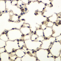 Immunohistochemical analysis of PHF11 staining in mouse lung formalin fixed paraffin embedded tissue section. The section was pre-treated using heat mediated antigen retrieval with sodium citrate buffer (pH 6.0). The section was then incubated with the antibody at room temperature and detected using an HRP conjugated compact polymer system. DAB was used as the chromogen. The section was then counterstained with haematoxylin and mounted with DPX. -
