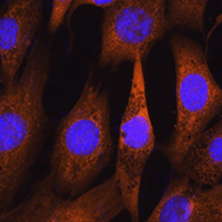 Immunofluorescent analysis of PHOSPHO2 staining in NIH3T3 cells. Formalin-fixed cells were permeabilized with 0.1% Triton X-100 in TBS for 5-10 minutes and blocked with 3% BSA-PBS for 30 minutes at room temperature. Cells were probed with the primary antibody in 3% BSA-PBS and incubated overnight at 4 °C in a humidified chamber. Cells were washed with PBST and incubated with a AF594-conjugated secondary antibody (red) in PBS at room temperature in the dark. DAPI was used to stain the cell nuclei (blue).