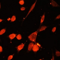 Immunofluorescent analysis of PI3K p85 gamma staining in NIH3T3 cells. Formalin-fixed cells were permeabilized with 0.1% Triton X-100 in TBS for 5-10 minutes and blocked with 3% BSA-PBS for 30 minutes at room temperature. Cells were probed with the primary antibody in 3% BSA-PBS and incubated overnight at 4 °C in a hidified chamber. Cells were washed with PBST and incubated with a Alexa Fluor 594-conjugated secondary antibody (red) in PBS at room temperature in the dark.