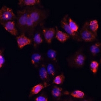 Immunofluorescent analysis of DAZL staining in HeLa cells. Formalin-fixed cells were permeabilized with 0.1% Triton X-100 in TBS for 5-10 minutes and blocked with 3% BSA-PBS for 30 minutes at room temperature. Cells were probed with the primary antibody in 3% BSA-PBS and incubated overnight at 4 °C in a hidified chamber. Cells were washed with PBST and incubated with a Alexa Fluor 594-conjugated secondary antibody (red) in PBS at room temperature in the dark.