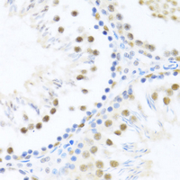 Immunohistochemical analysis of DDX46 staining in rat testis formalin fixed paraffin embedded tissue section. The section was pre-treated using heat mediated antigen retrieval with sodium citrate buffer (pH 6.0). The section was then incubated with the antibody at room temperature and detected using an HRP conjugated compact polymer system. DAB was used as the chromogen. The section was then counterstained with haematoxylin and mounted with DPX.