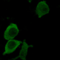 Immunofluorescent analysis of DKK1 staining in U251MG. Formalin-fixed cells were permeabilized with 0.1% Triton X-100 in TBS for 5-10 minutes and blocked with 3% BSA-PBS for 30 minutes at room temperature. Cells were probed with the primary antibody in 3% BSA-PBS and incubated overnight at 4 °C in a humidified chamber. Cells were washed with PBST and incubated with a AF488-conjugated secondary antibody (green) in PBS at room temperature in the dark.