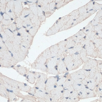 Immunohistochemical analysis of Dystrophin staining in mouse heart formalin fixed paraffin embedded tissue section. The section was pre-treated using heat mediated antigen retrieval with sodium citrate buffer (pH 6.0). The section was then incubated with the antibody at room temperature and detected using an HRP conjugated compact polymer system. DAB was used as the chromogen. The section was then counterstained with haematoxylin and mounted with DPX. -