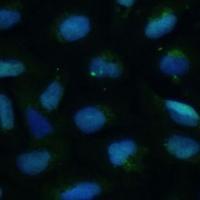 Immunofluorescent analysis of dUTPase staining in U2OS cells. Formalin-fixed cells were permeabilized with 0.1% Triton X-100 in TBS for 5-10 minutes and blocked with 3% BSA-PBS for 30 minutes at room temperature. Cells were probed with the primary antibody in 3% BSA-PBS and incubated overnight at 4 °C in a hidified chamber. Cells were washed with PBST and incubated with a Alexa Fluor 488-conjugated secondary antibody (green) in PBS at room temperature in the dark.