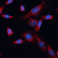 Immunofluorescent analysis of Dishevelled 1 staining in NIH3T3 cells. Formalin-fixed cells were permeabilized with 0.1% Triton X-100 in TBS for 5-10 minutes and blocked with 3% BSA-PBS for 30 minutes at room temperature. Cells were probed with the primary antibody in 3% BSA-PBS and incubated overnight at 4 °C in a humidified chamber. Cells were washed with PBST and incubated with a AF594-conjugated secondary antibody (red) in PBS at room temperature in the dark. DAPI was used to stain the cell nuclei (blue).
