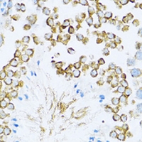 Immunohistochemical analysis of Dishevelled 1 staining in mouse testis formalin fixed paraffin embedded tissue section. The section was pre-treated using heat mediated antigen retrieval with sodium citrate buffer (pH 6.0). The section was then incubated with the antibody at room temperature and detected using an HRP conjugated compact polymer system. DAB was used as the chromogen. The section was then counterstained with haematoxylin and mounted with DPX. -