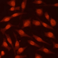 Immunofluorescent analysis of EED staining in U2OS cells. Formalin-fixed cells were permeabilized with 0.1% Triton X-100 in TBS for 5-10 minutes and blocked with 3% BSA-PBS for 30 minutes at room temperature. Cells were probed with the primary antibody in 3% BSA-PBS and incubated overnight at 4 °C in a hidified chamber. Cells were washed with PBST and incubated with a Alexa Fluor 594-conjugated secondary antibody (red) in PBS at room temperature in the dark.