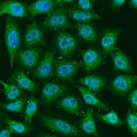 Immunofluorescent analysis of HIF PHD3 staining in U2OS cells. Formalin-fixed cells were permeabilized with 0.1% Triton X-100 in TBS for 5-10 minutes and blocked with 3% BSA-PBS for 30 minutes at room temperature. Cells were probed with the primary antibody in 3% BSA-PBS and incubated overnight at 4 °C in a hidified chamber. Cells were washed with PBST and incubated with a Alexa Fluor 488-conjugated secondary antibody (green) in PBS at room temperature in the dark.