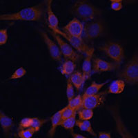Immunofluorescent analysis of EIF2B staining in NIH3T3 cells. Formalin-fixed cells were permeabilized with 0.1% Triton X-100 in TBS for 5-10 minutes and blocked with 3% BSA-PBS for 30 minutes at room temperature. Cells were probed with the primary antibody in 3% BSA-PBS and incubated overnight at 4 °C in a humidified chamber. Cells were washed with PBST and incubated with a AF594-conjugated secondary antibody (red) in PBS at room temperature in the dark. DAPI was used to stain the cell nuclei (blue).