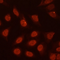 Immunofluorescent analysis of BF-1 staining in U2OS cells. Formalin-fixed cells were permeabilized with 0.1% Triton X-100 in TBS for 5-10 minutes and blocked with 3% BSA-PBS for 30 minutes at room temperature. Cells were probed with the primary antibody in 3% BSA-PBS and incubated overnight at 4 °C in a hidified chamber. Cells were washed with PBST and incubated with a Alexa Fluor 594-conjugated secondary antibody (red) in PBS at room temperature in the dark.