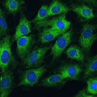 Immunofluorescent analysis of FRMD6 staining in C6 cells. Formalin-fixed cells were permeabilized with 0.1% Triton X-100 in TBS for 5-10 minutes and blocked with 3% BSA-PBS for 30 minutes at room temperature. Cells were probed with the primary antibody in 3% BSA-PBS and incubated overnight at 4 °C in a humidified chamber. Cells were washed with PBST and incubated with a AF488-conjugated secondary antibody (green) in PBS at room temperature in the dark. DAPI was used to stain the cell nuclei (blue).